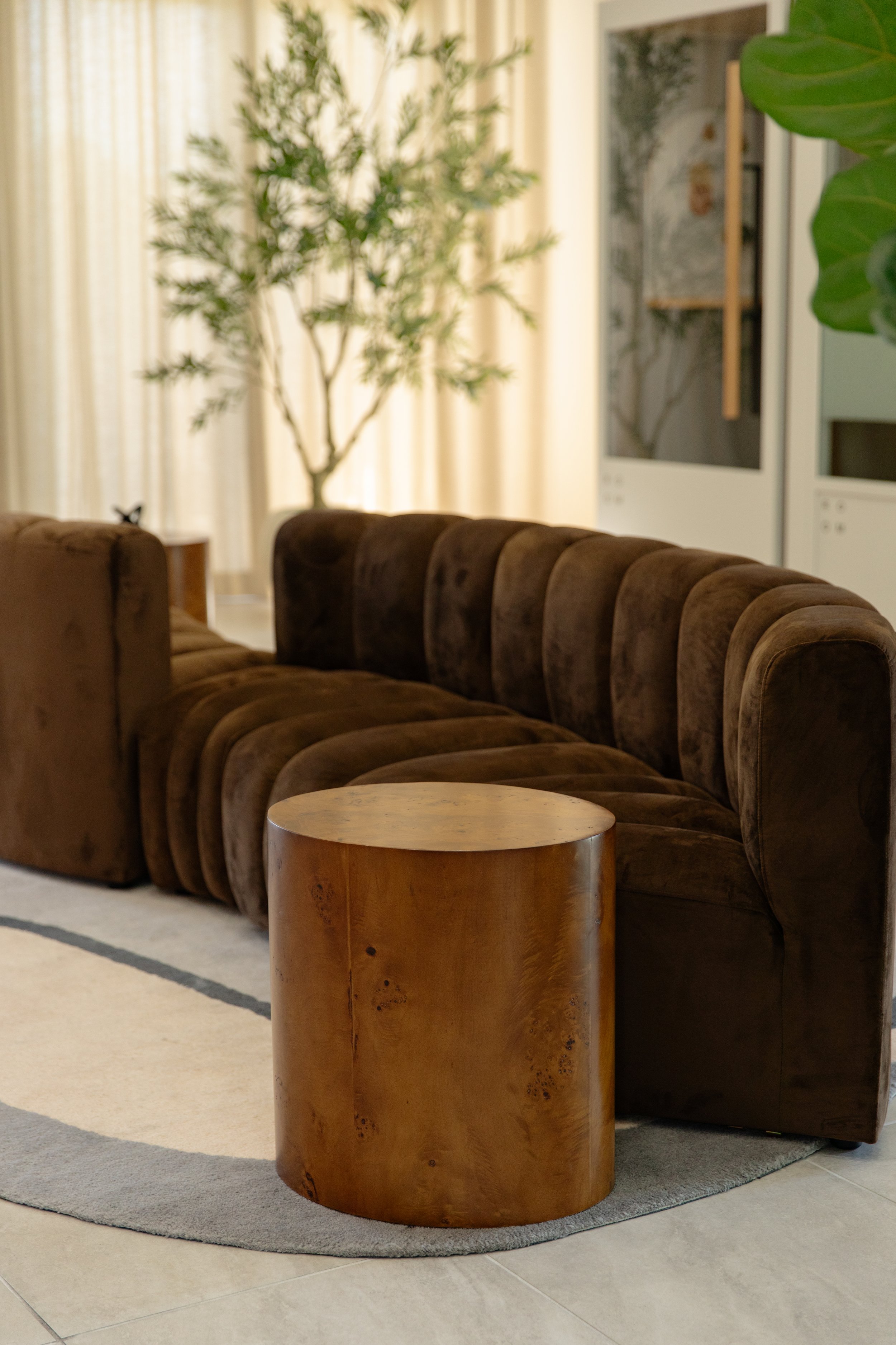 Paired with simple wood side tables and a soft, layered rug, the seating arrangement feels grounded yet relaxed, designed to be used without overthinking it.