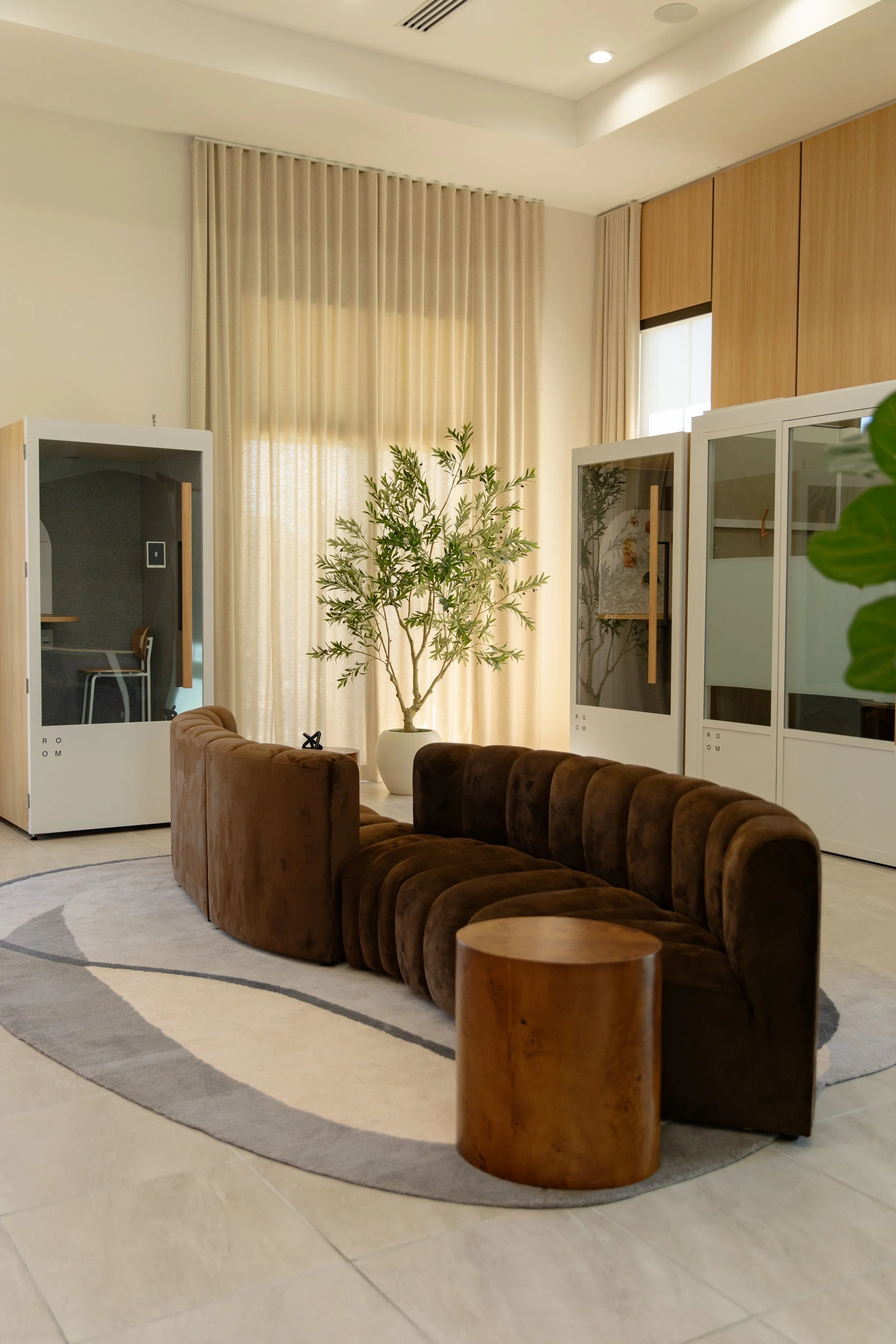 A sculptural, curved sofa anchors the layout, creating a sense of enclosure without walls. Its form naturally encourages conversation, while the plush upholstery introduces a level of warmth that contrasts the more structured work areas throughout the space.