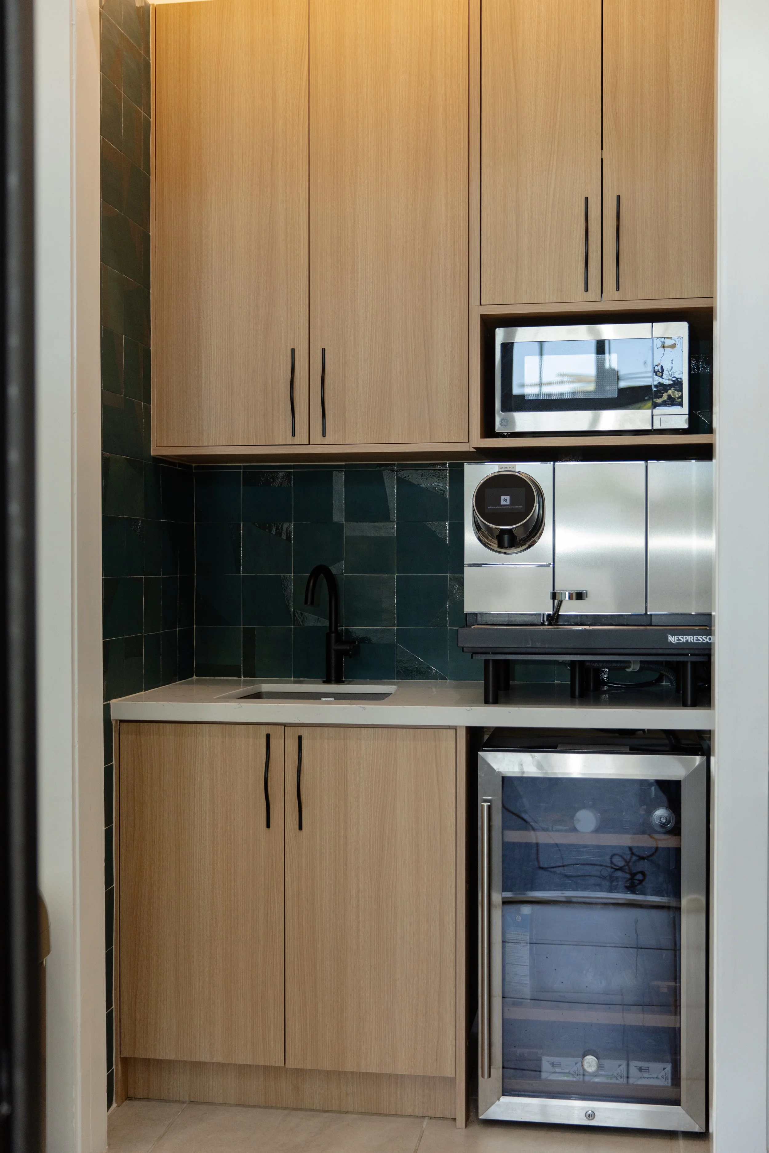 Custom wood cabinetry brings warmth and continuity, while the deep green tile backsplash adds richness and contrast, turning this once-overlooked area into a standout feature. Integrated appliances and a built-in coffee station make the space as practical as it is beautiful, perfect for both quick breaks and daily use by staff and residents.