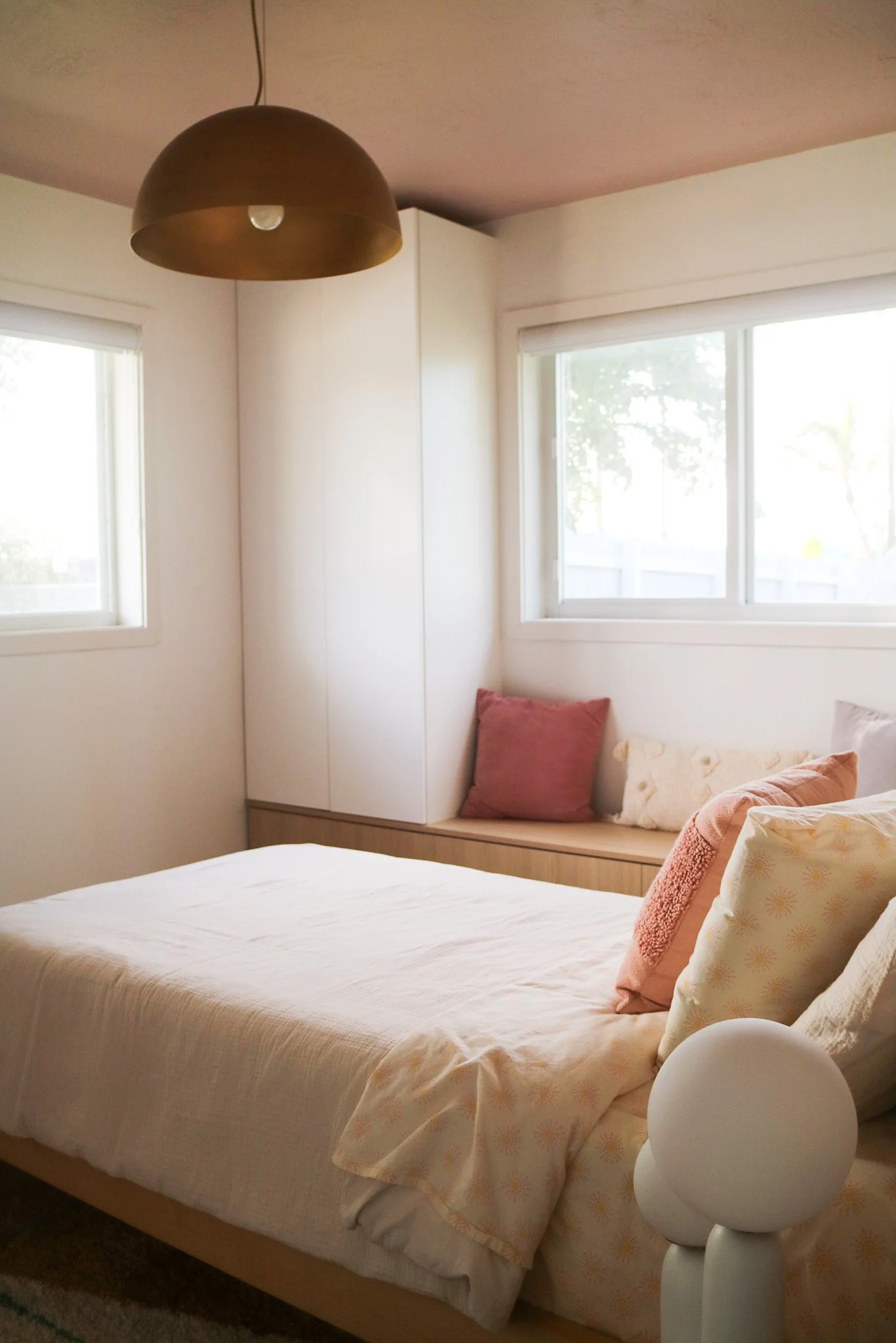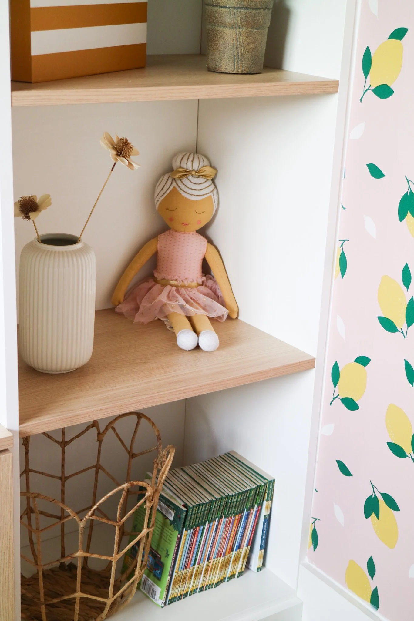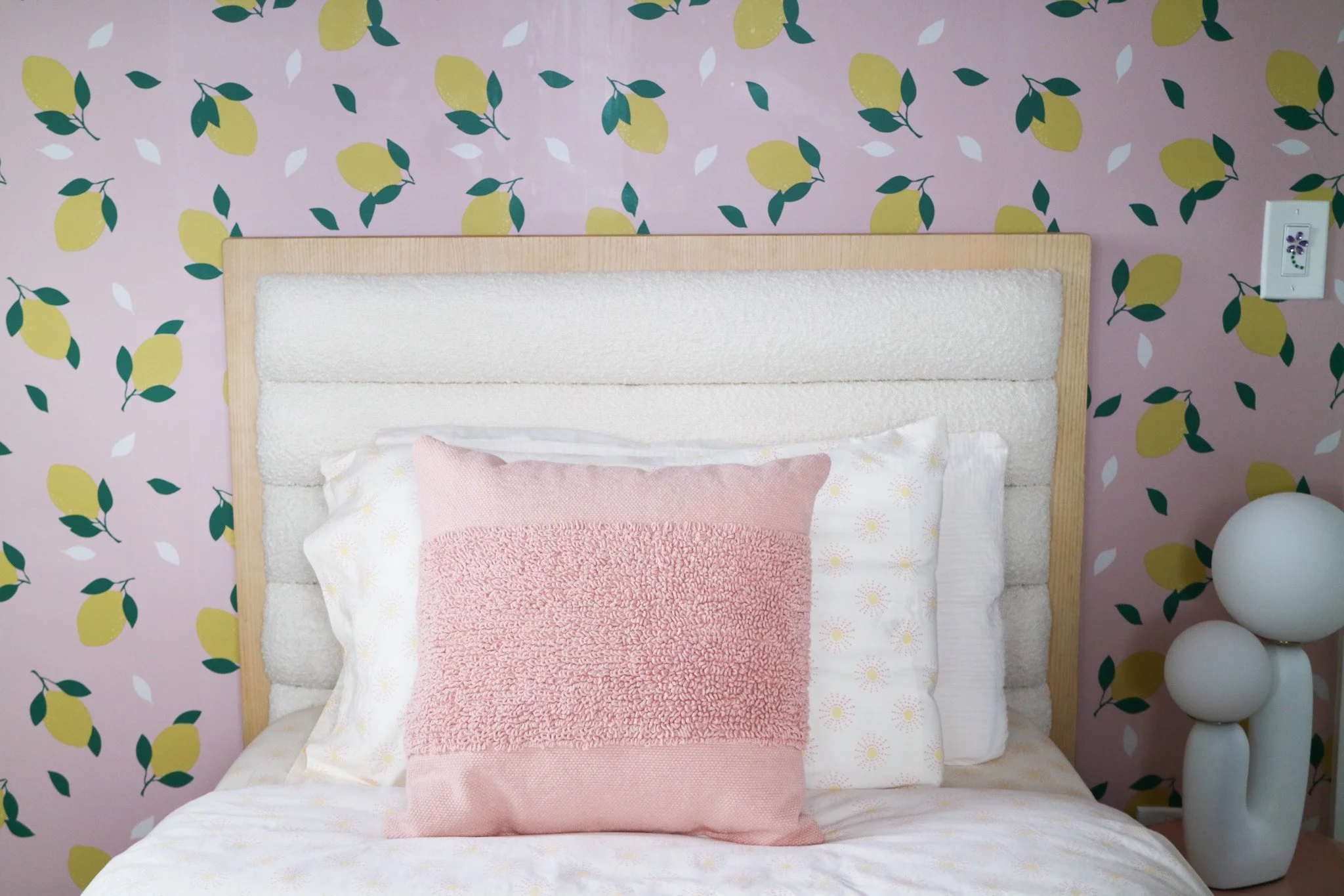 This project was an exciting and nostalgic one. I redesigned my daughter, G’s, room. It was a rewarding and exciting project to see her room come together so beautifully. The room expresses an energetic and feminine vibe to it. This was a way to help her transform into those young pre-teen years with this room makeover. The first thing we made sure was to follow a certain color palette that all began with this lemon wallpaper which Giuliana chose. It was the perfect transitional palette from little to big girl status. Storage was a need in this small space so I designed this custom double door storage cabinet, bench with drawer underneath & an open shelf bookcase made by Reyes Closet Design. He was a dream to work with providing him the designs and picking materials was a breeze. He definitely makes you feel confident in the project.