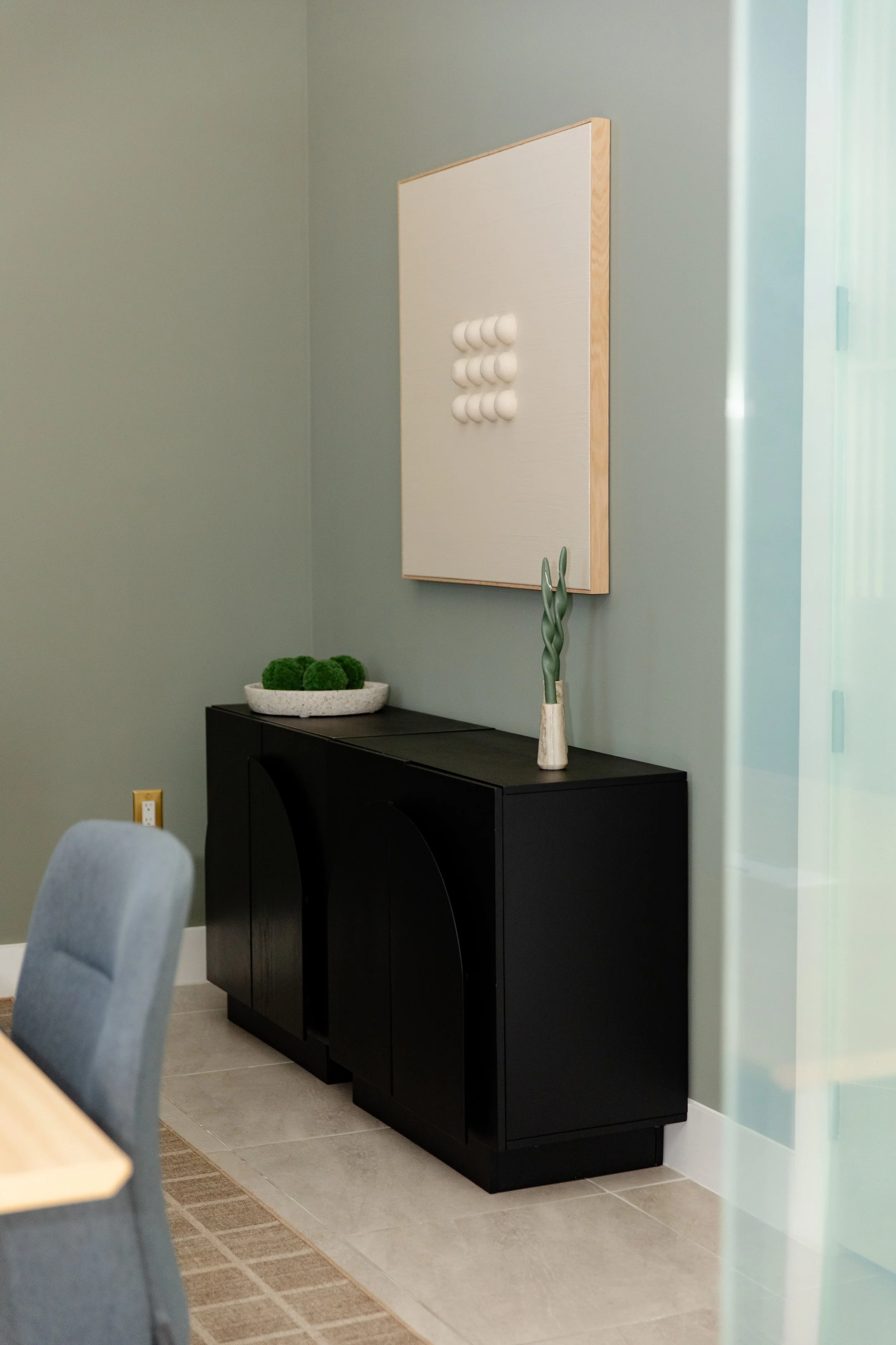 We carried through a palette of warm woods, soft neutrals, and clean lines to create a calm, modern environment. Subtle styling elements, like greenery and abstract artwork, add depth without distracting from the purpose of the room.